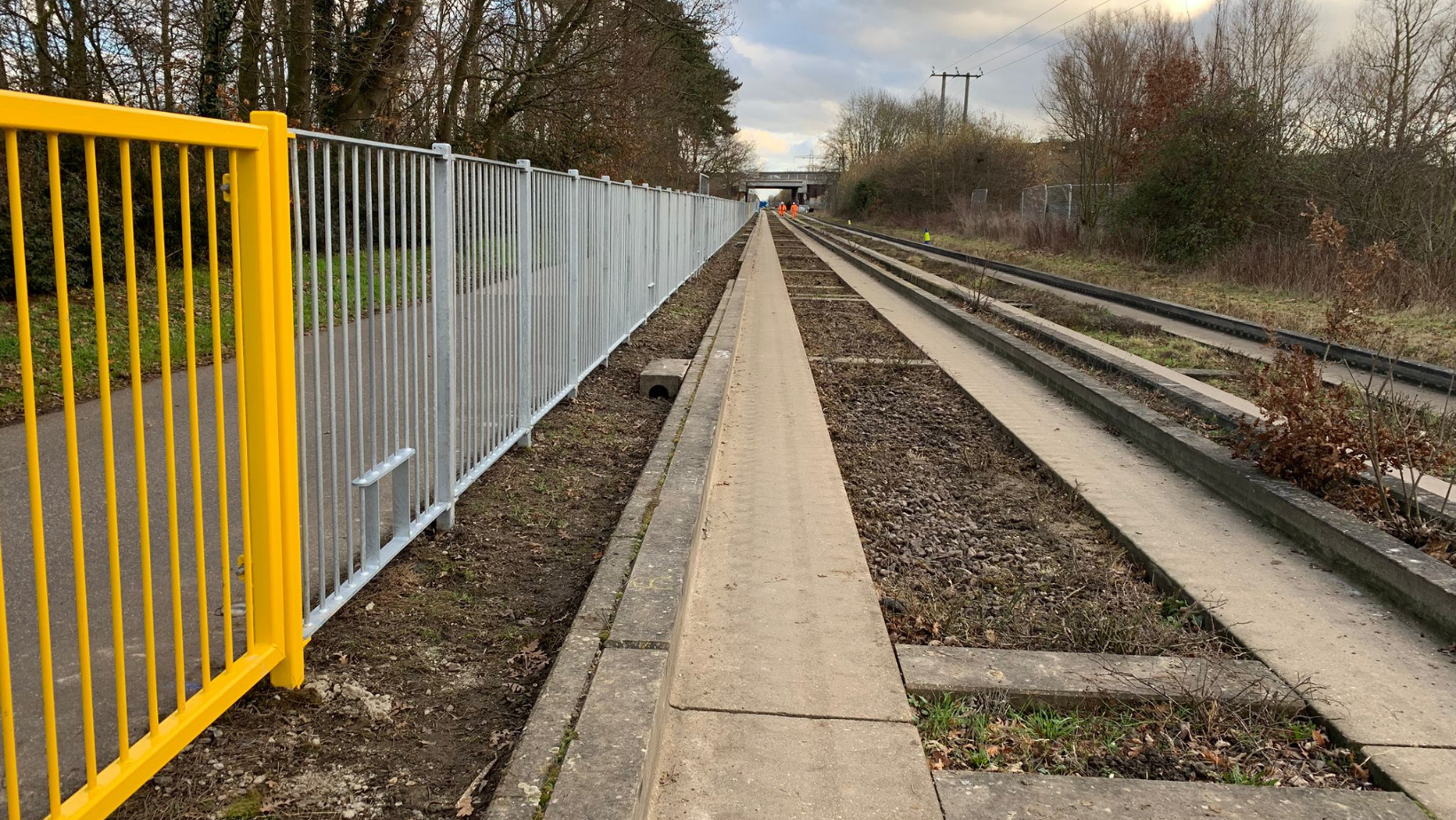 Separately, yellow evacuation gates are installed at approximately 100m intervals. Once around 100m of posts have been put in place, standard fence panels are installed between the posts and the gates. Gaps are left for non-standard panels, including narrower panels (used where the alignment of the fencing changes) or panels which include a slope in their design to accommodate height changes along the length of the route. This is why there are occasional gaps on the Trumpington Spur - these panels are due to arrive and be installed within the next few weeks.